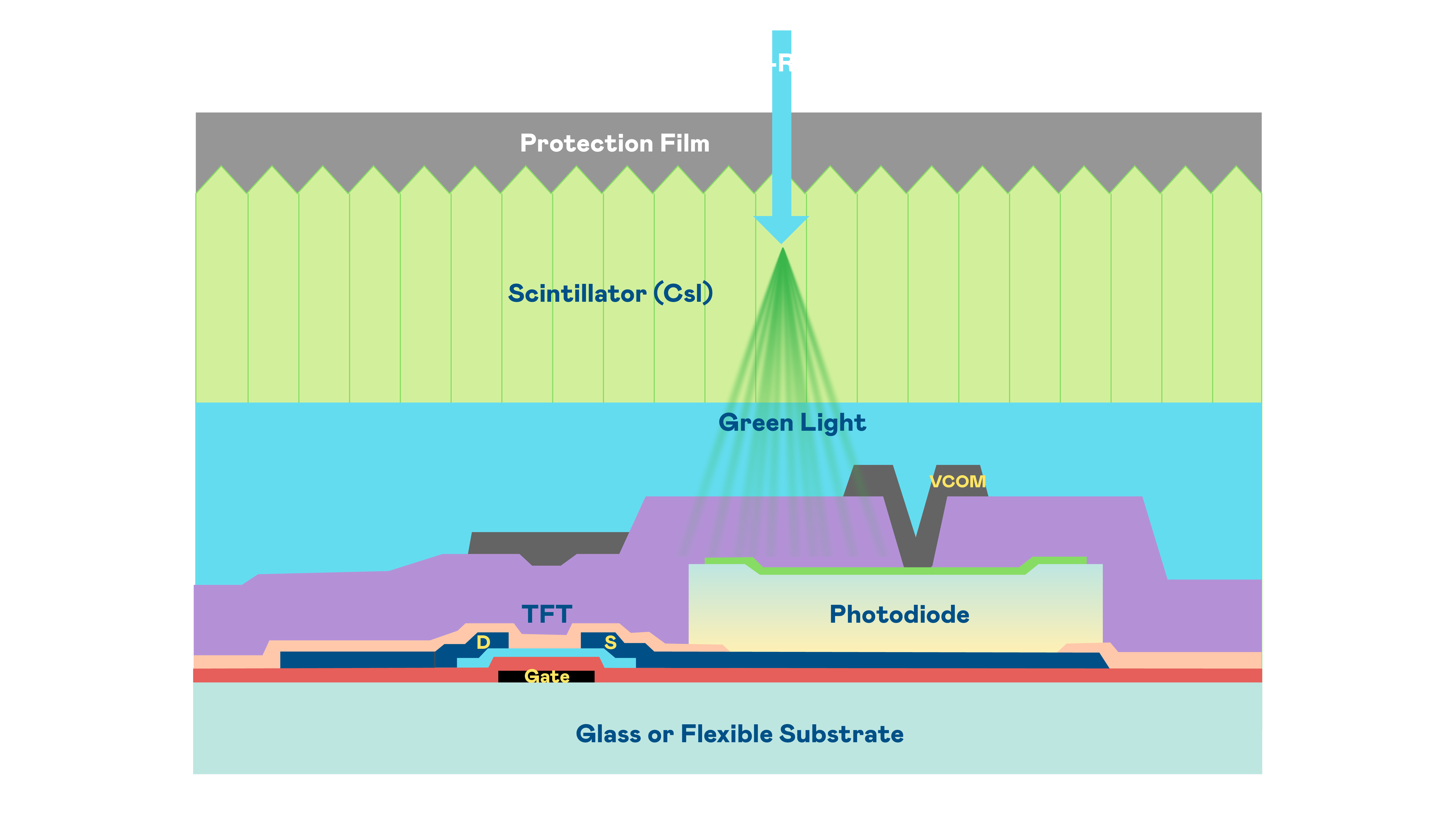 尊龙的X光影像感测阵列使用薄膜电晶体 (TFT) 作为每个像素的读取开关,搭配光电二极体(Photodiode)的光电转换元件,用以感测X光影像讯号。